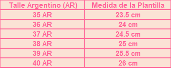 Consistencia: Las medidas de la tabla corresponden a la plantilla interna del calzado.