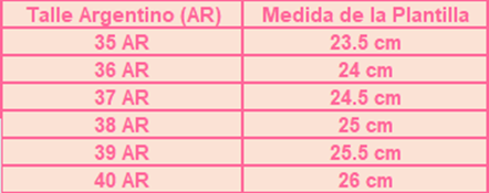 Dato extra: Tené en cuenta que las medidas corresponden a la plantilla interna del calzado.
